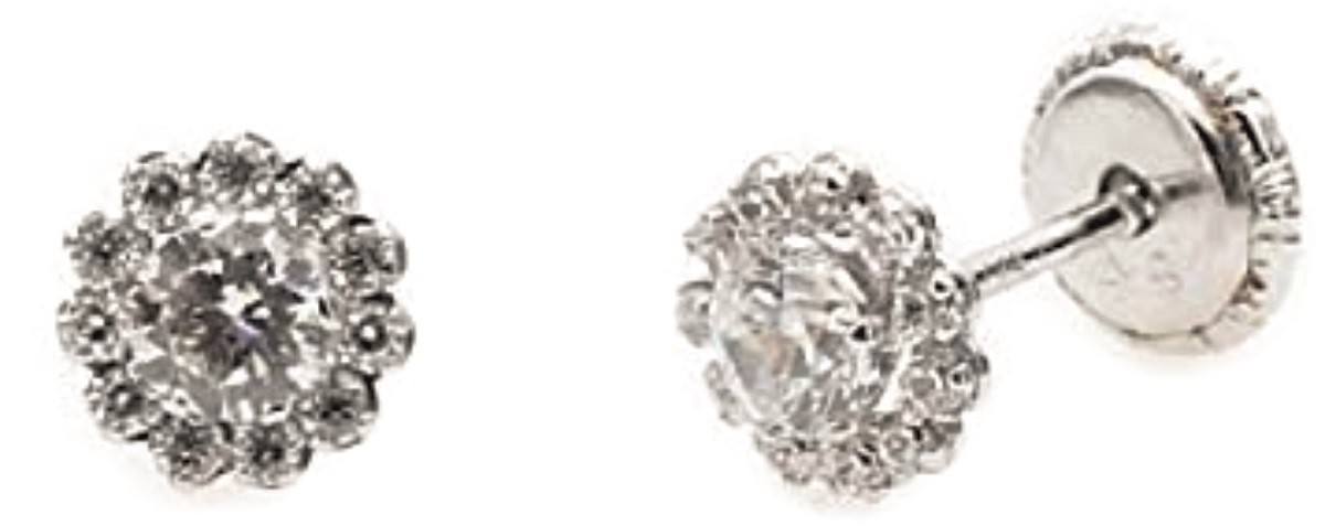 Clásica y atemporal forma de roseta de circonitas para estos pendientes que destacan por su luminosidad. Miden 5mm de diámetro y llevan cierre de tuerca.