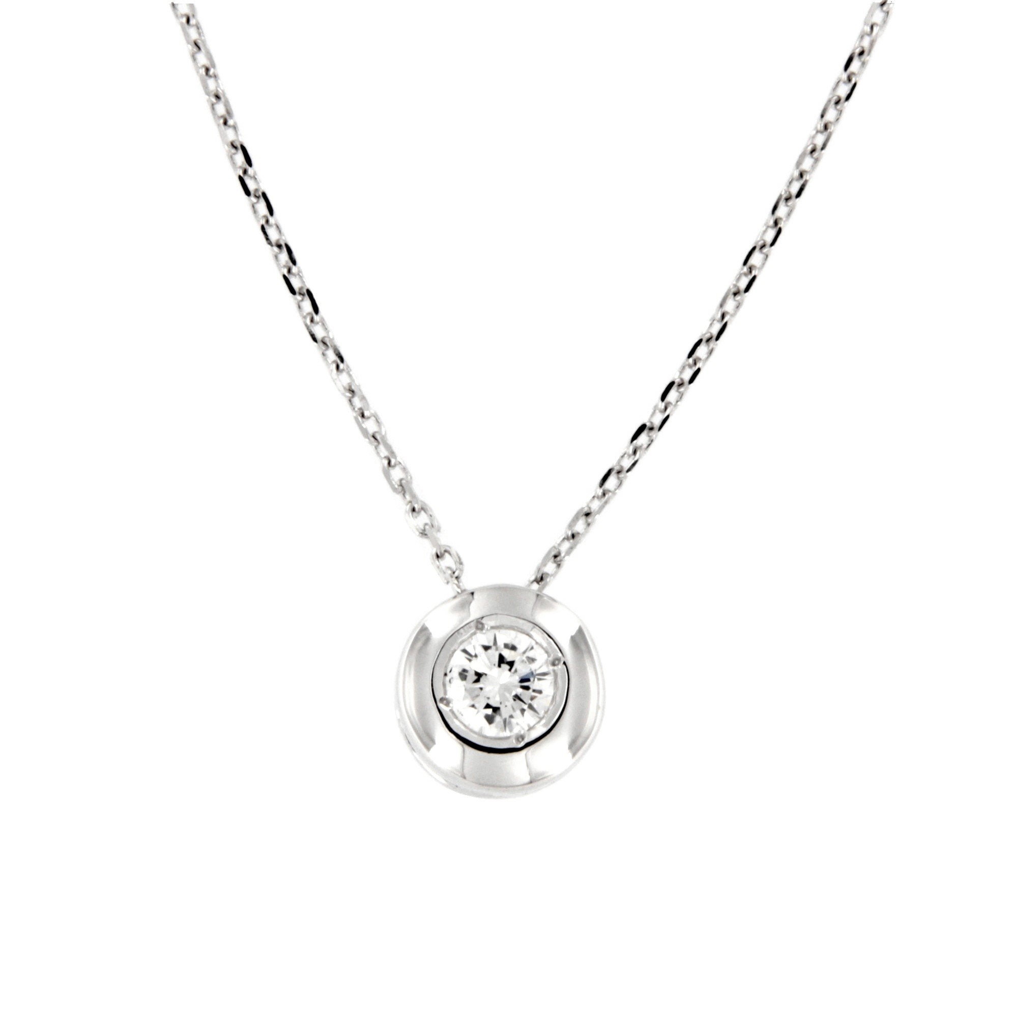 Colgante Chatón de 6 mm. con Cadena de 45 cm Fabricado en Oro Blanco 18 kt y Engastado con un Diamante Natural en Talla Brillante H SI de 0,13 Quilates. Disponible en Pendientes.