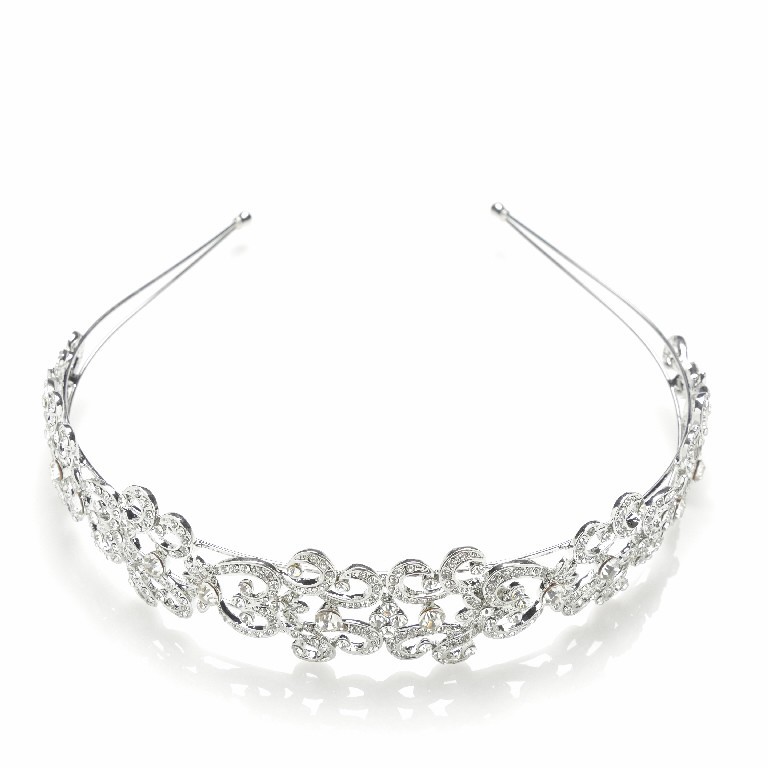 Diadema para novia y ceremonia de metal y strass blanco, con un cuidado diseño de ornamentación con volutas y corazones. Para dar un toque de luz a cualquier peinado. De la prestigiosa casa "Cano" suministradora de complementos para la serie de televisión "Seis hermanas"