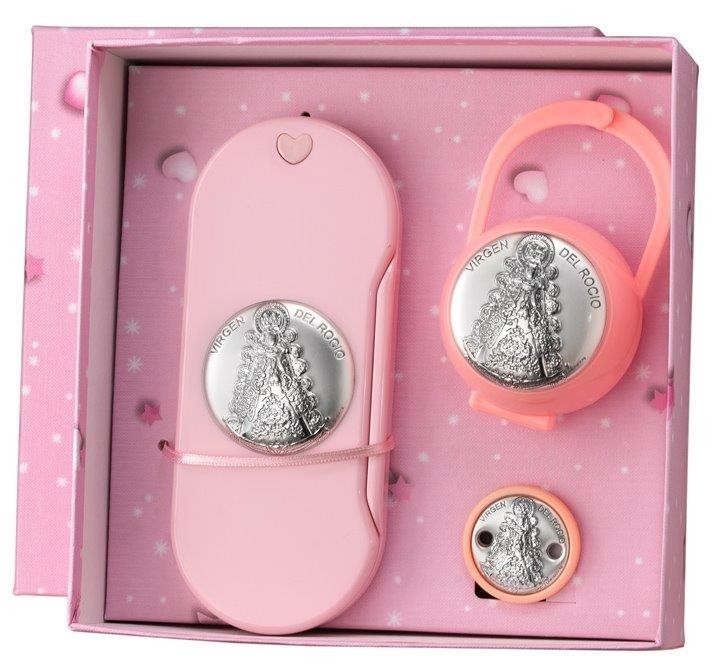 Juego Para Bebé Con Pinza, Chupetero Y Cubiertos Con Aplicación En Plata Bilaminada Para Personalizar.