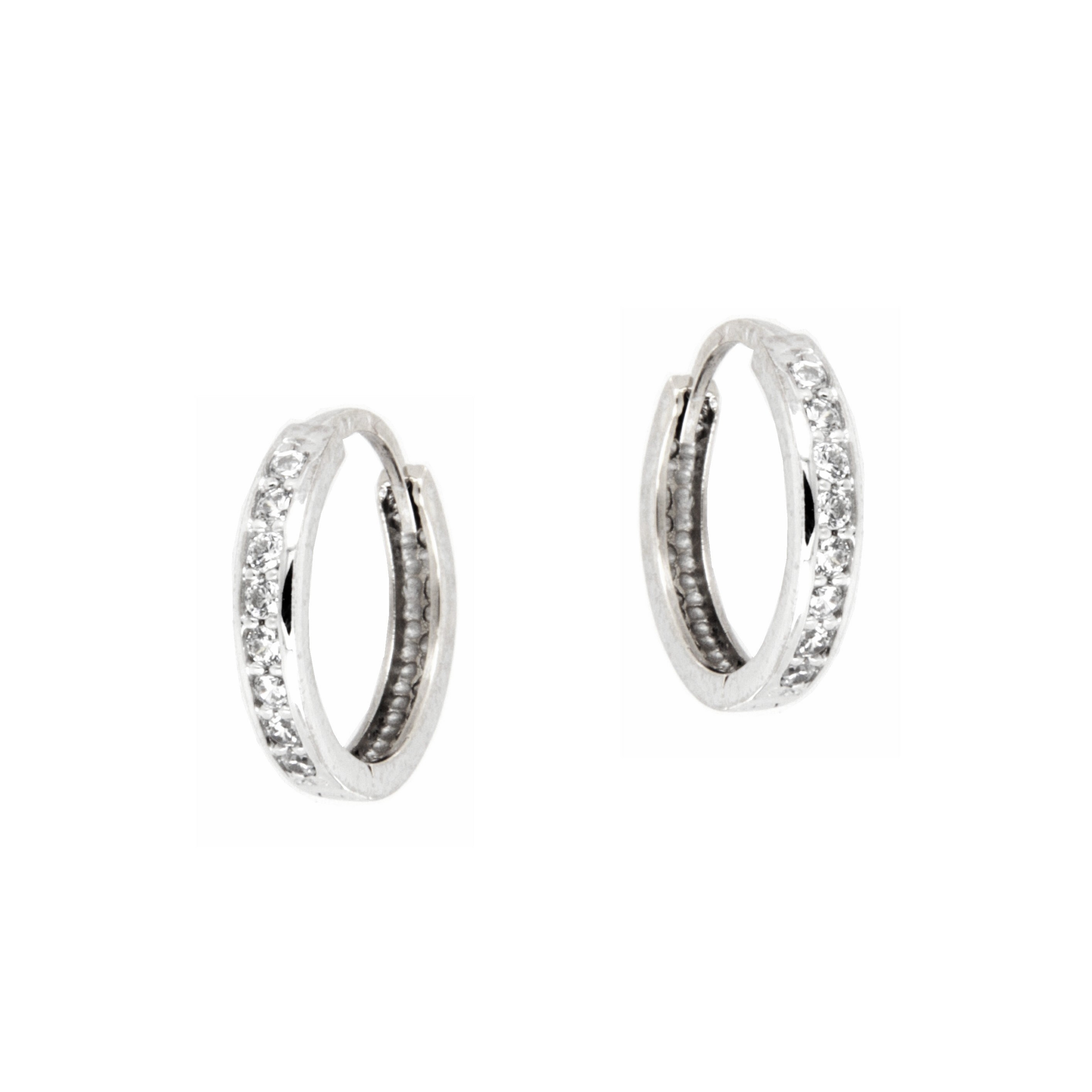 Pendientes de Aro de 2 x 12,5 mm. con Cierre de Bisagra. Fabricados en Oro Blanco de 18kt y Engastados en Carril con Circonitas.
