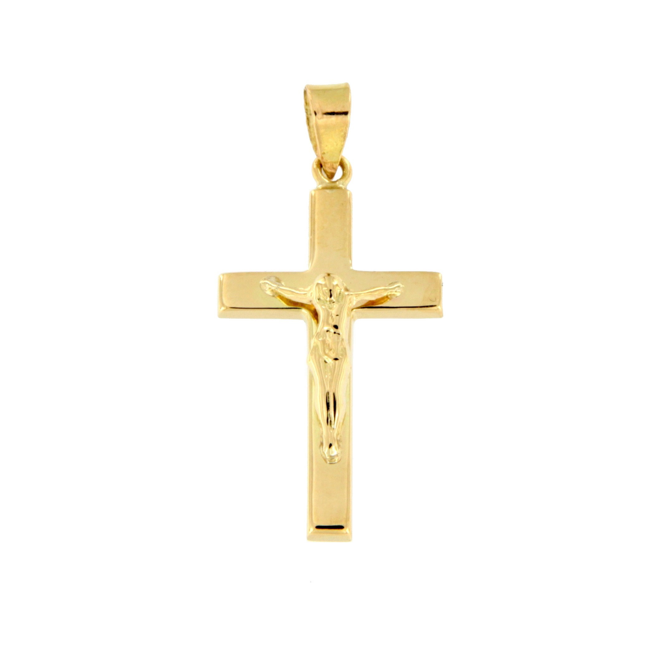 Cruz con Cristo de Tubo Plano de 2,5 x 1 mm. Medida 21 x 13 mm. Fabricada en Oro amarillo 18kt.
