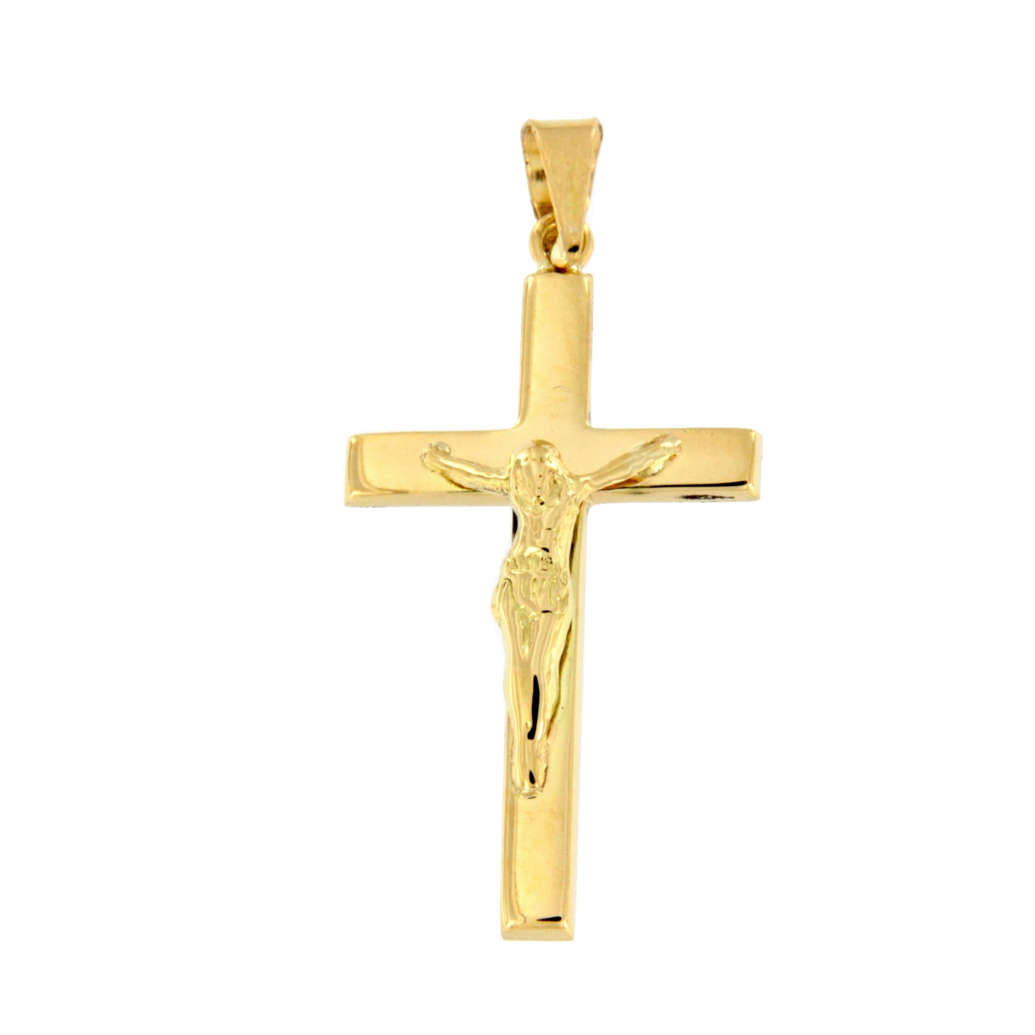 Cruz con Cristo de Tubo Plano de 2,5 x 1 mm. Medida 25 x 15 mm. Fabricada en Oro amarillo 18kt.