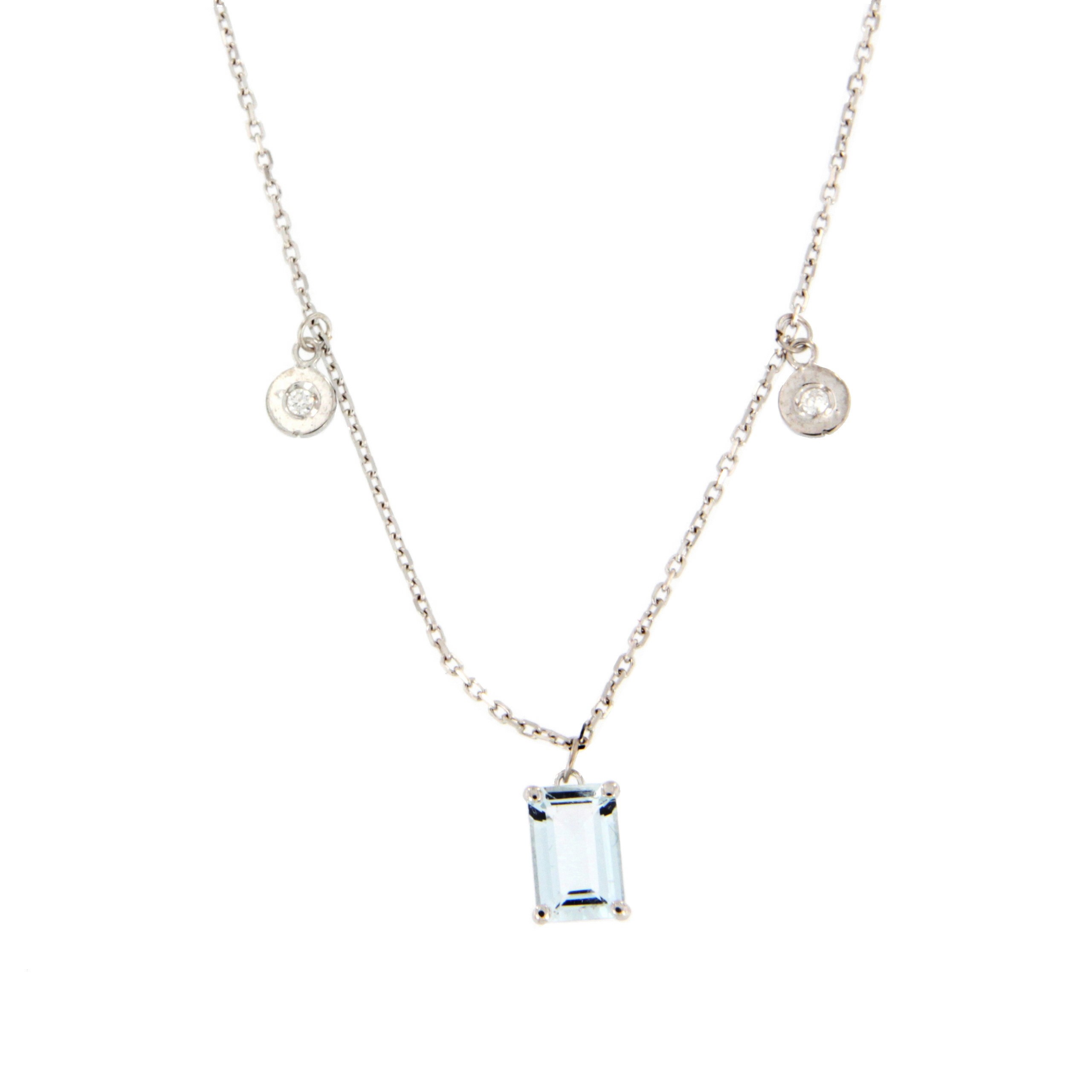 Gargantilla de 45 - 40 cm. Fabricado en Oro Blanco 18 kt y Engastado en Garras con un Aguamarina Natural Talla Rectangular de 5 x 4 mm. y dos Chatones de 3 mm con dos Diamantes Naturales Talla Brillante H SI 0,02 Quilates.