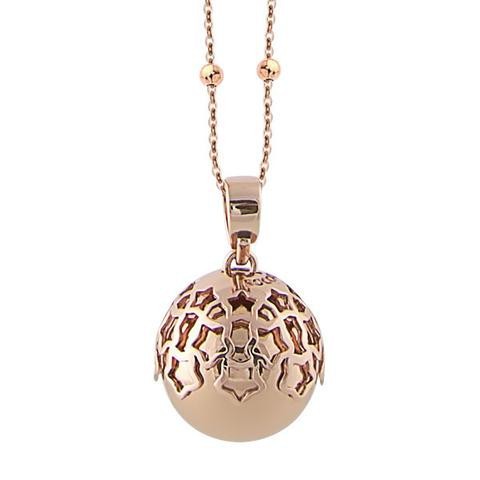 Bonito llamador de ángeles de bronce chapado en oro rosa, con cadena de 100 cm. Se puede poner doble y queda de 50cm. La esfera es de 20mm De la colección Angelomio de Boccadamo