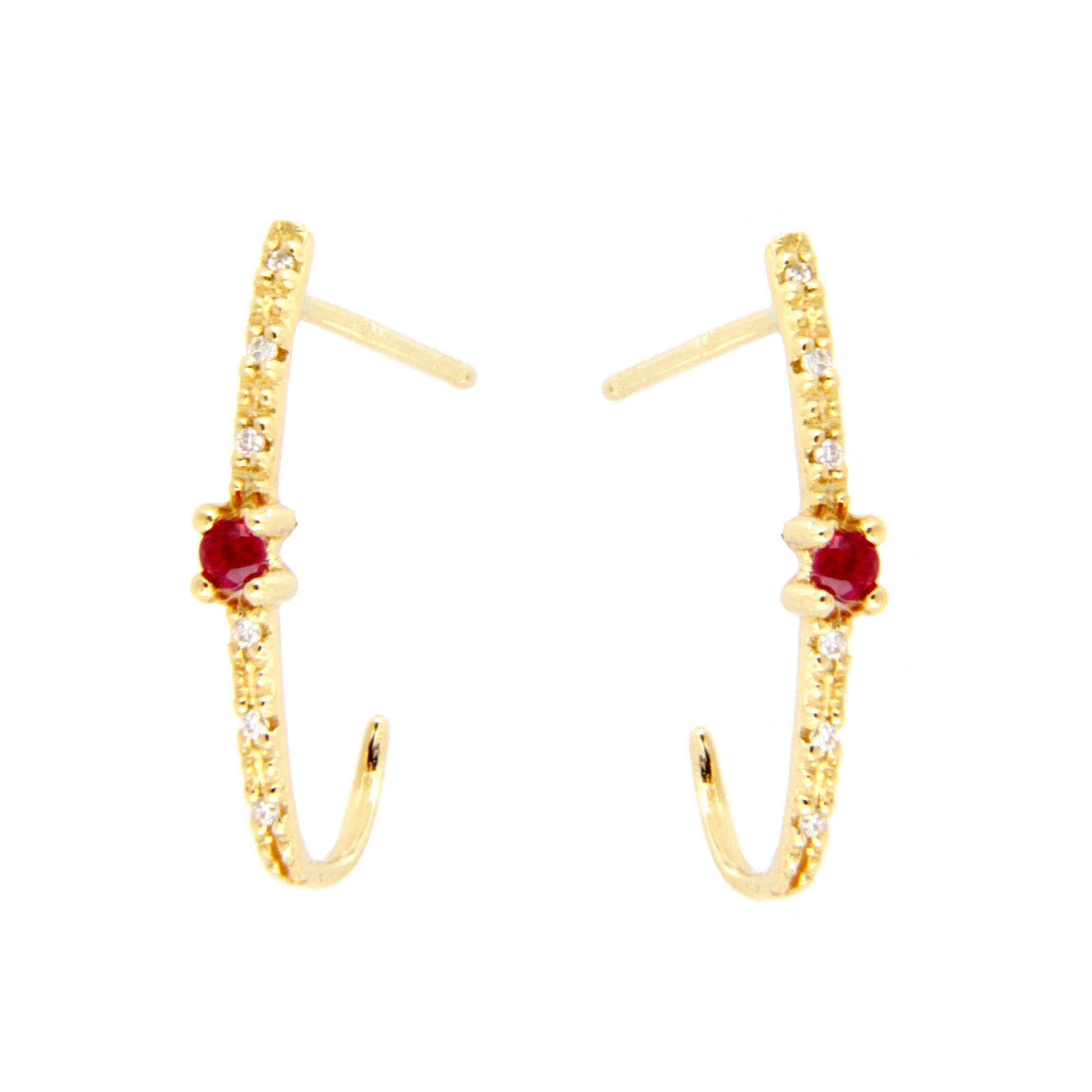 Pendientes de Medio Aro Oval de 17 x 8 mm Ancho 1,3 mm y con una Garra de 2,3 mm Fabricados en Oro Amarillo 18kt, con Cierre de Presión y Engastados con 2 Rubíes Naturales de 2 mm y 12 Diamantes Naturales Talla Brillante H SI 0,048 Quilates.