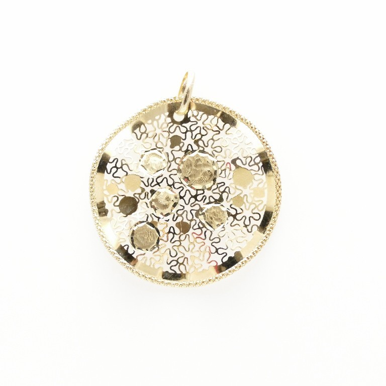Bonito y moderno colgante de oro de 18 quilates, su diseño juega con distintas texturas, acabados y calados, el disco donde se desarrolla el conjunto de la imagen está levemente ondulado, con lo que acentúa más aún la sensación de textura que le da un aire juvenil. Mide 37 mm de diámetro