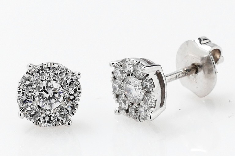 Pendientes en oro blanco de 18 quilates. Roseta de diamantes talla brillante de 0,36 ktes. Miden 7mm de diámetro. Cierre de presión.