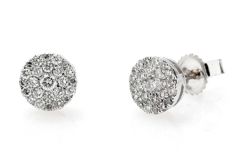 Pendientes circulares en oro blanco de 18 quilates con pavé de diamantes talla brillante. Miden 6mm y llevan cierre de presión
