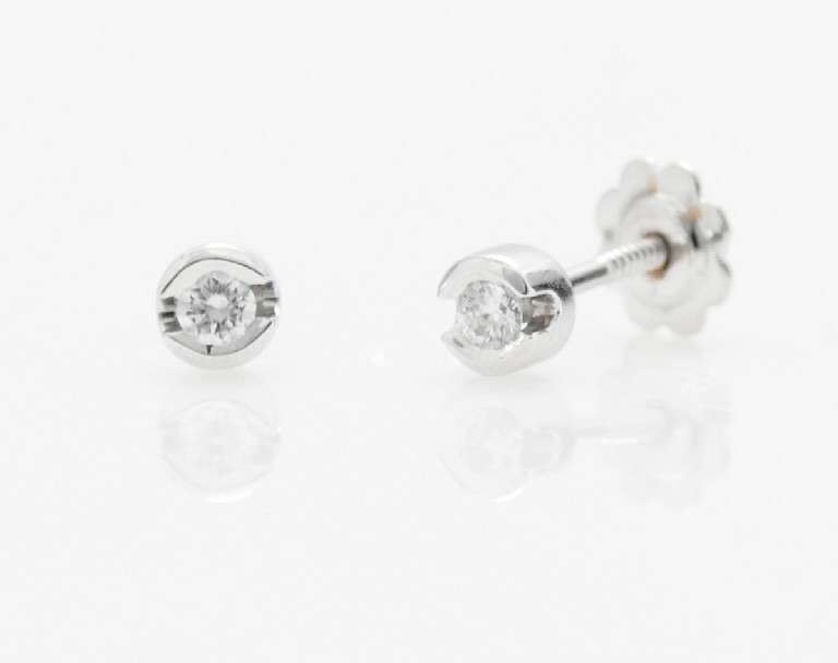 Pequeños pendientes de oro blanco con diamantes, en forma de chatón partido a la mitad para dar más luz a la piedra. Miden 4mm de diámetro y llevan cierre de rosca para que no molesten a las princesas más pequeñas de la familia.
