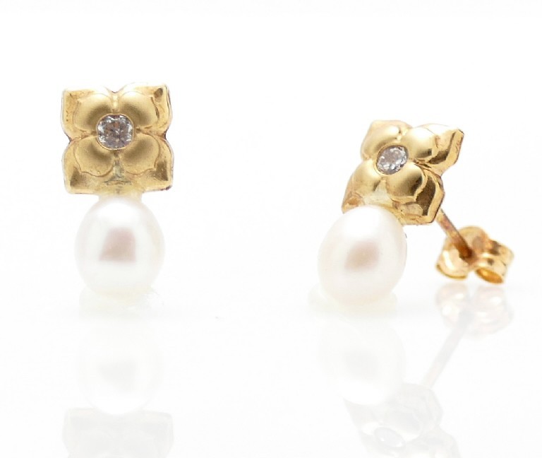 Pendientes tu y yo, la parte superior es de oro amarillo y combina las texturas brillantes con las mates para dar más volumen, tiene una forma cuadrada y sin embargo orgánica, con una circonita en el centro. la parte inferior del pendiente es una perla cultivada ovalada. Miden 5x10 mm y llevan cierre de presión.