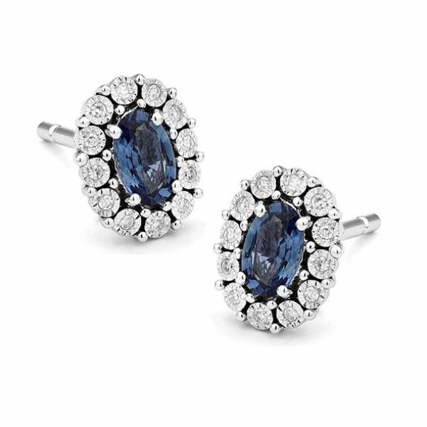 Pendientes roseta de oro blanco rodinado de 9x7mm, dos zafiros naturales de 3x5mm y 24 diamantes naturales single cut, 0.05quilates. Cierre de presión. Disponible en anillo y colgante con cadena.