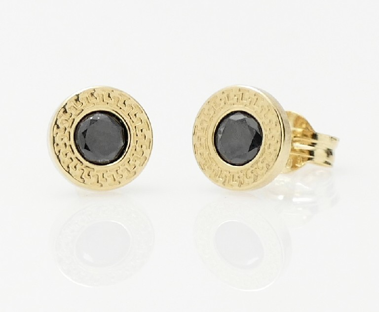 Pendientes de chatón dibujado en oro amarillo y circonita negra. Unisex. Miden 8mm y llevan cierre de presión