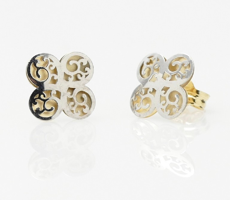 Pendientes para señora de oro bicolor, juega en su diseño con los colores y las formas a través de los dibujos calados en la parte superior. Miden 9,5mm y llevan cierre de presión.