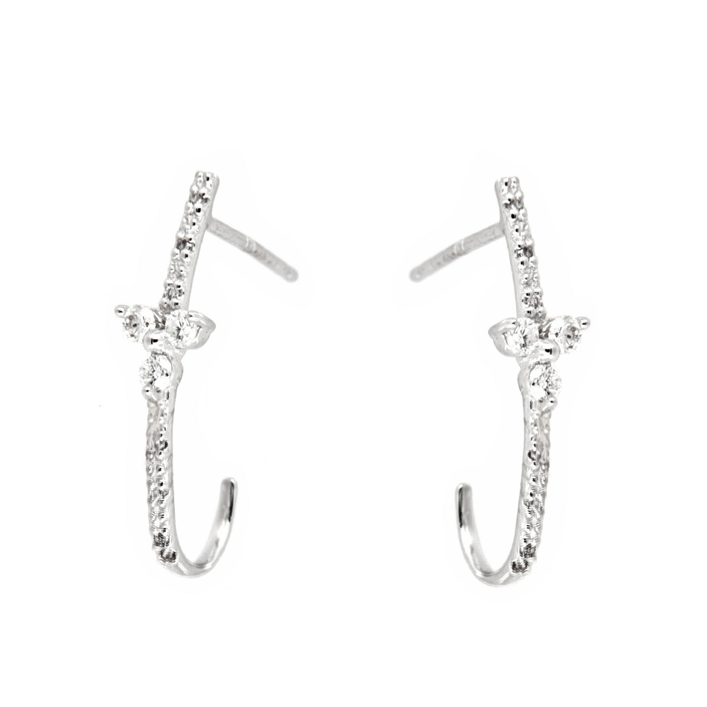 Pendientes de Medio Aro Oval de 17 x 8 mm Ancho 1,3 mm y con Trébol de 4,5 mm Fabricados en Oro Blanco 18kt, con Cierre de Presión y Engastados con 18 Diamantes Naturales Talla Brillante H SI 0,198 Quilates.