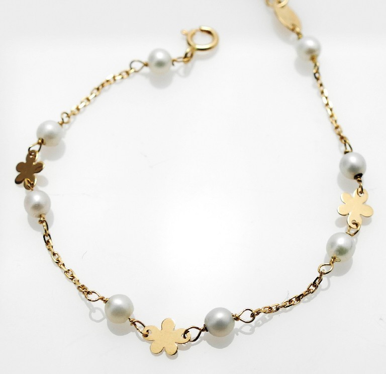 Pulserita para bebés en oro de 18 quilates, maciza, con perlitas cultivadas y una flor entre perlas. Mide 13cm de largo y lleva cierre de reasa.
