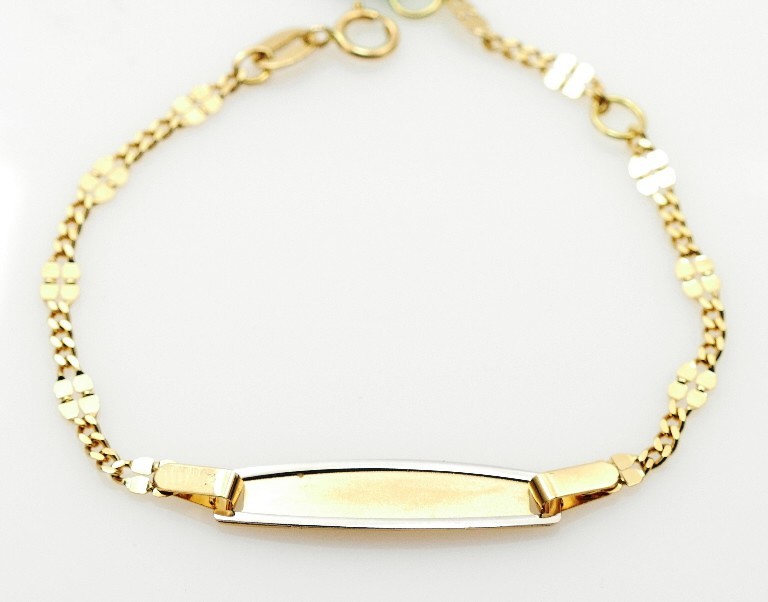 Pulsera para bebé personalizable realizada en oro de 18 quilates maciza, lleva un borde en la chapa de oro blanco. Tiene dos posiciones, a 12 y a 14cm. El ancho de la malla es de 3mm, y la medida de la chapa es de 22x5mm. Cierre de reasa.