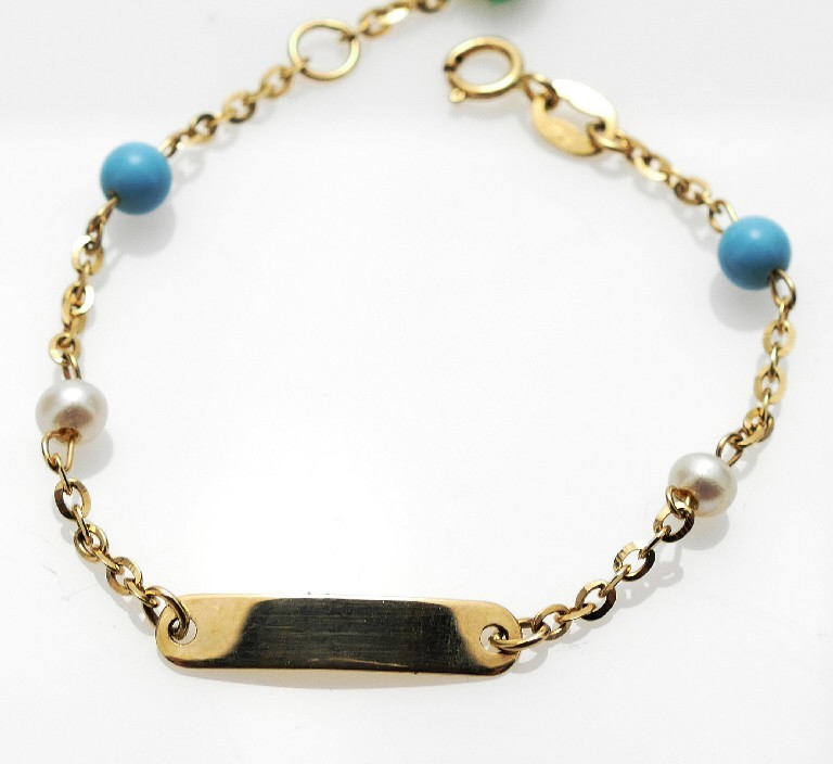 Pulsera para bebé personalizable en oro de 18 quilates,maciza, con perlas cultivadas y turquesas en la malla. Mide 12 o 13,5cm, las medidas de la chapa son 3,5x18mm. Cierre de reasa