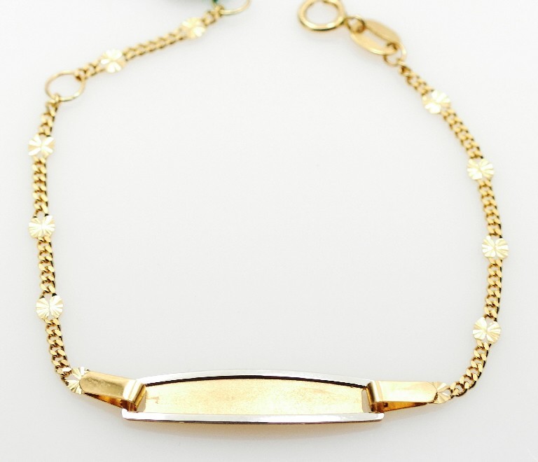 Pulsera para bebé personalizable en oro de 18 quilates amarillo, maciza, con detalle de borde en oro blanco en la chapa. Mide 11,5 o 13,5 cm. Ancho de la malla 2mm. Medidas de la chapa. 22x5mm. Cierre de reasa.