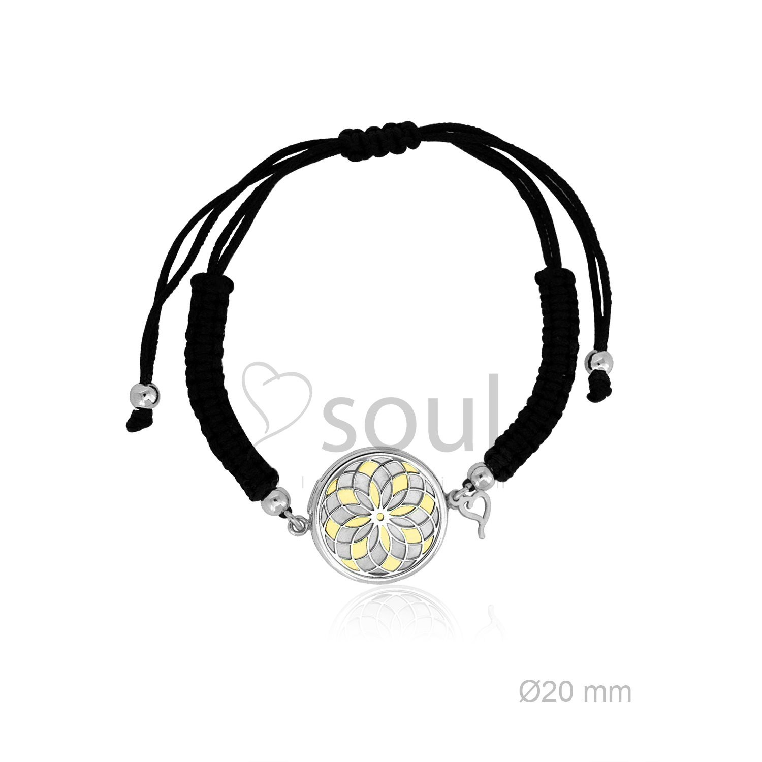 Pulsera unisex de plata con mandala, realizada con plata en dos tonos, rodiado y chapado en oro, sobre una base blanca de nacar, el brazalete es de macramé negro. El disco mide 20mm de diámetro.