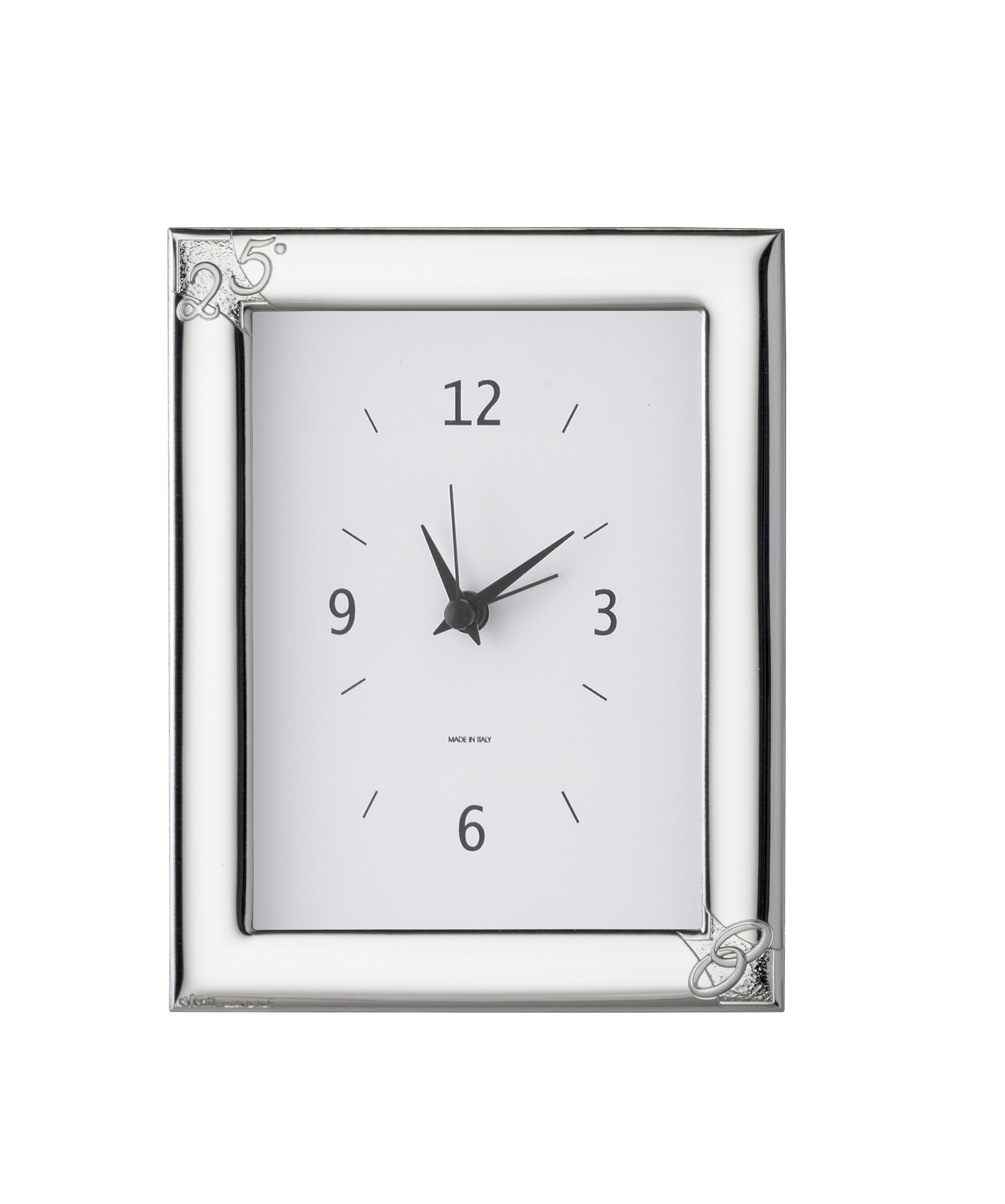 Precioso Reloj 25 aniversario 9x13 Personalizado Para Bodas Plata, decorado y acabado en plata Bilaminada de Primera Ley 925.