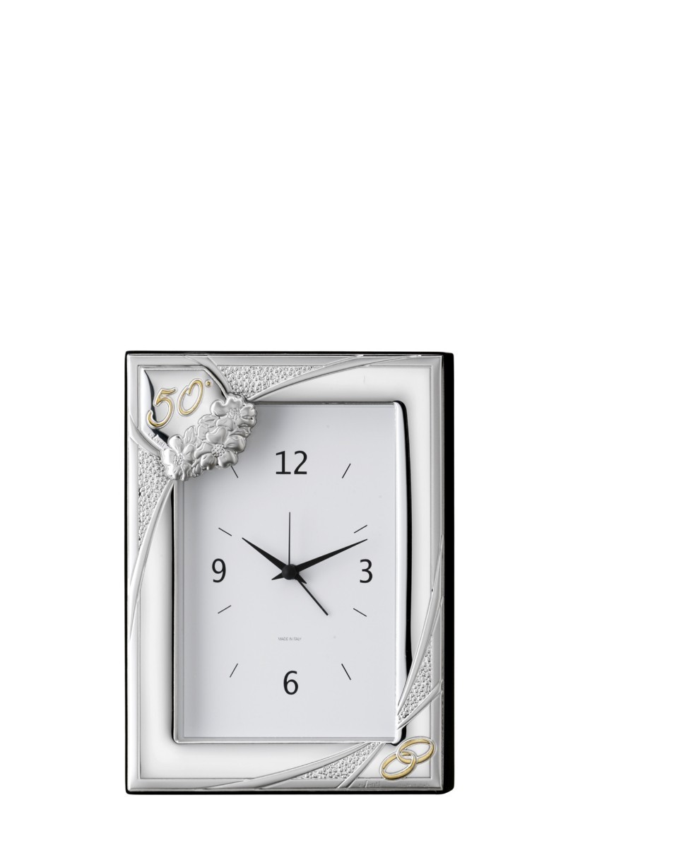 Precioso Reloj 50 aniversario 10x15 Personalizado para Bodas de Oro, decorado y acabado en plata Bilaminada de Primera Ley 925.