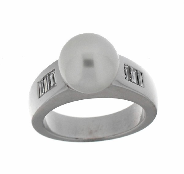 Sortija Hecha a Mano por Artesanos Joyeros con Perla Australiana de 9,5 mm. Brazo con 6 Diamantes Naturales Talla Baguet HVS 0,40 Quilates