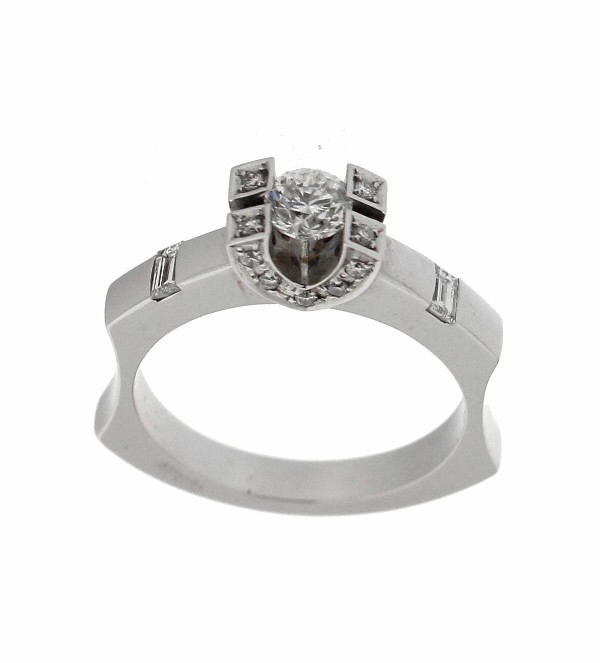 Solitario Hecho a Mano por Artesanos Joyeros. Centro Montado en Garras con un Diamante Natural Talla Brillante HVS 0,34 Quilates, Garras con 18 Diamantes Naturales Talla Brillante HVS 0,13 Quilates y Brazo con 2 Diamantes Naturales Talla Baguet HVS 0,15 Quilates