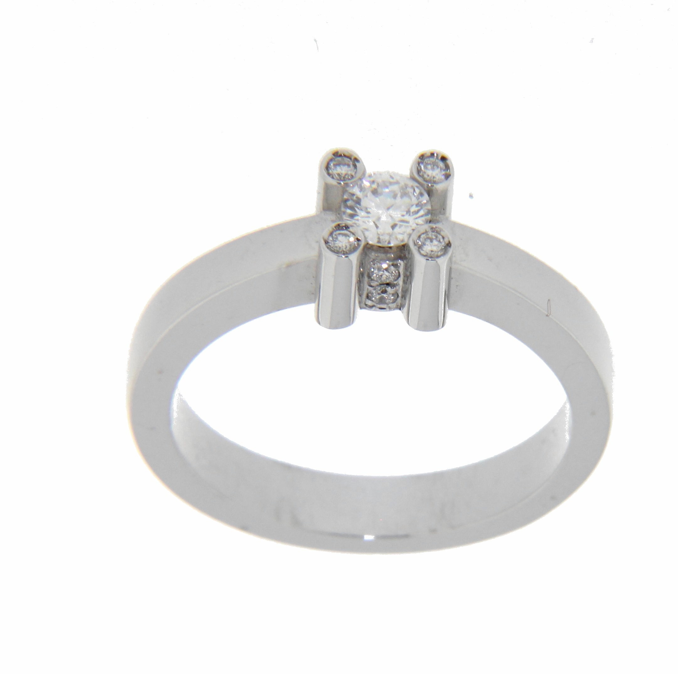 Solitario Hecho a Mano por Artesanos Joyeros. Centro Montado en Garras con un Diamante Natural Talla Brillante HVS 0,18 Quilates, Garras con 4 Diamantes Naturales Talla Brillante HVS 0,03 Quilates y Lados con 4 Diamantes Naturales Talla Brillante HVS 0,03 Quilates