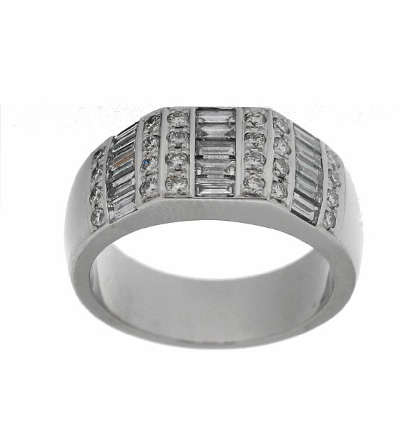 Sortija Hecha a Mano por Artesanos Joyeros. Centros Montados con 15 Diamantes Naturales Talla Baguet HVS 0,72 Quilates y Brazo con 24 Diamantes Naturales Talla Brillante HVS 0,29 Quilates