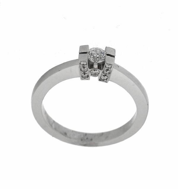 Solitario Hecho a Mano por Artesanos Joyeros. Centro Montado en Garras con un Diamante Natural Talla Brillante HVS 0,15 Quilates, Garras con 16 Diamantes Naturales Talla Brillante HVS 0,08 Quilates y Brazo con 2 Diamantes Naturales Talla Brillante HVS 0,02 Quilates