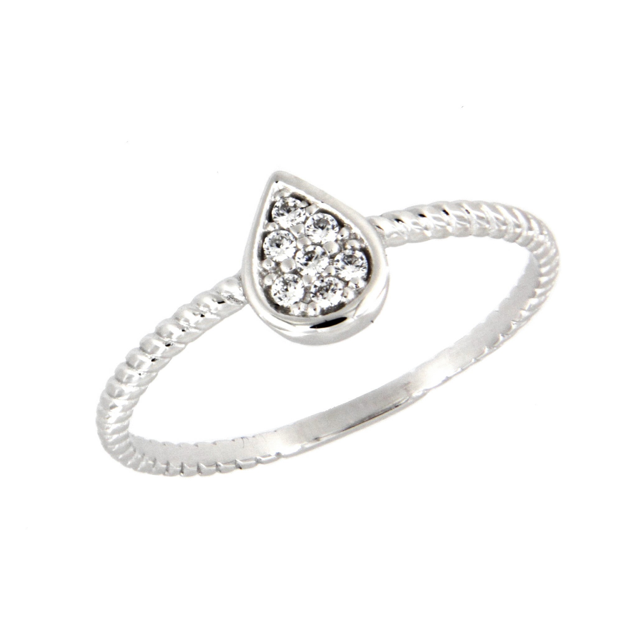 Sortija Lágrima de 8 x 6 mm con Brazo de 1,5 mm Fabricada en Oro Blanco 18 kt y Engastada con Circonitas. Disponible en Pendientes. 51-230-B-P