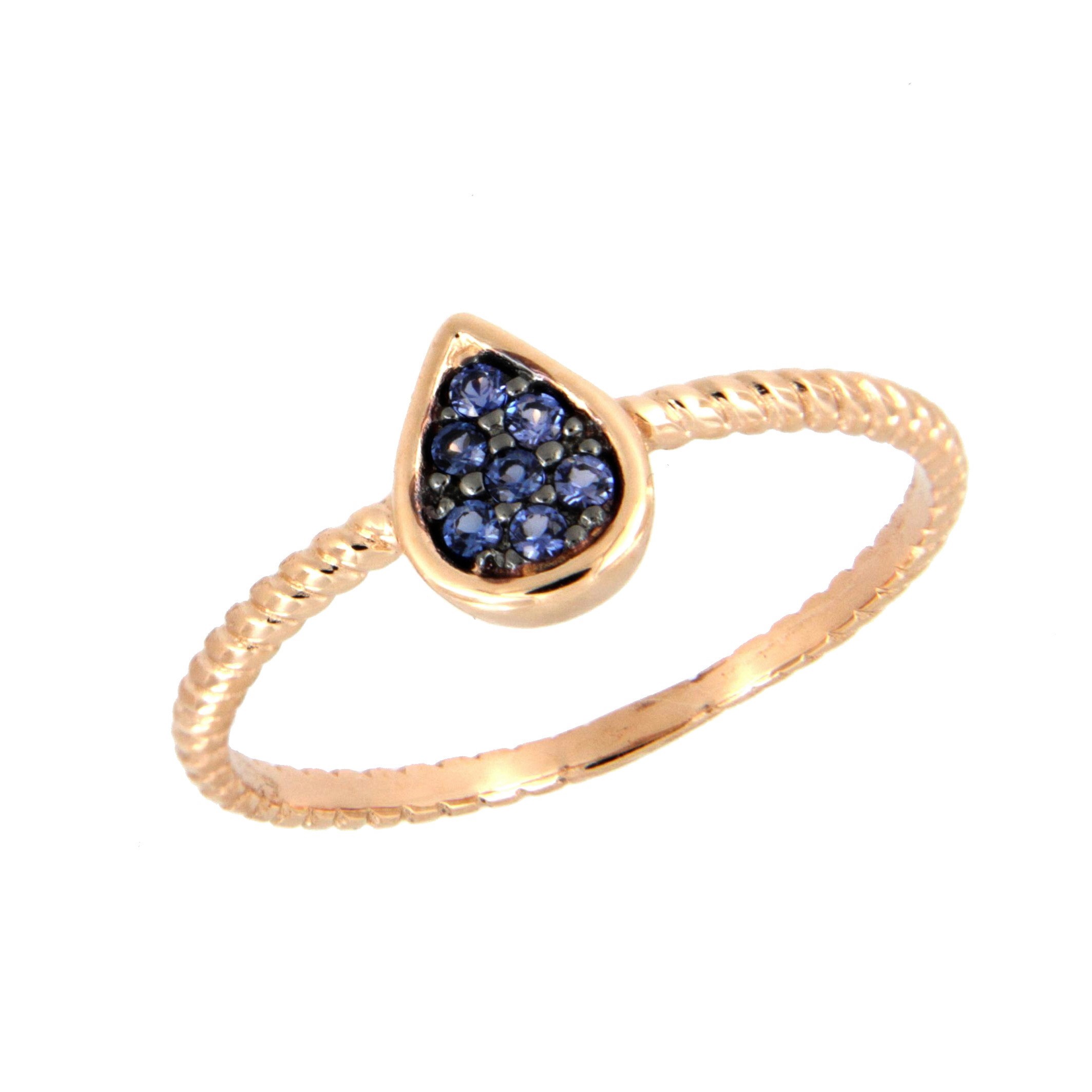 Sortija Lágrima de 8 x 6 mm con Brazo de 1,5 mm Fabricada en Oro Rosa 18 kt y Engastada con Circonitas Azules. Disponible en Pendientes. 51-230-RA-P