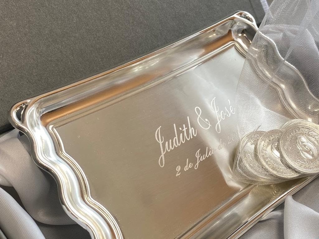 Arras metal con bandeja y estuche 17x12 para bodas.