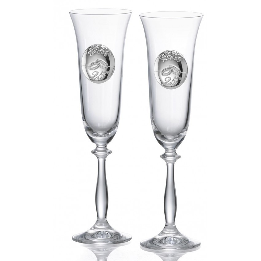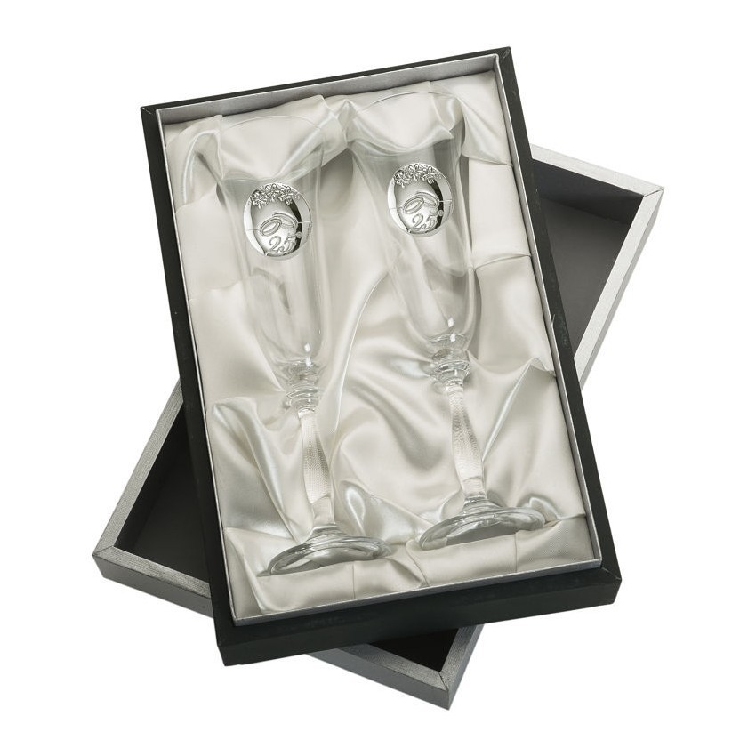 - En el precio se incluye 2 copas, aplicación en plata bilaminada 25 aniversario, grabado en copas y embalaje premium.