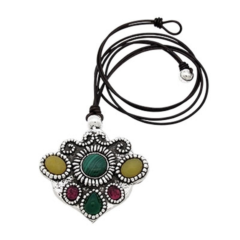 Colgante de plata con piedras naturales, malaquita, jade y terbium. El colgante mide 8cm de ancho x 7,5cm de alto. El cuero mide 70cm que hace un collar de una medida total de casi 80cm de largo. El cierre consta de una bola de plata y un ojal de cuero.