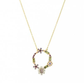 Gargantilla en plata chapada en oro amarillo con círculo central compuesto por amatista cabujón y cuarzos adamantinos de colores. Mide 45cm ampliable a 48cm