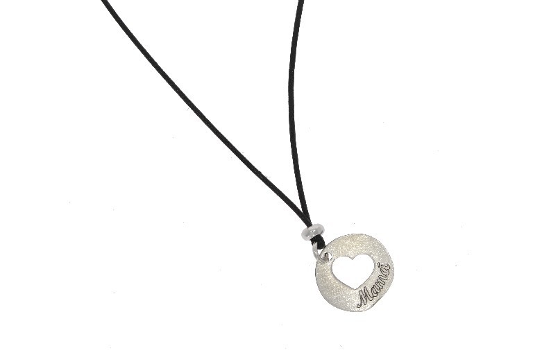 Informal esta gargantilla de cuero con cierre de plata y colgantito con Mamá grabado y esmaltado con un corazón troquelado en el centro.