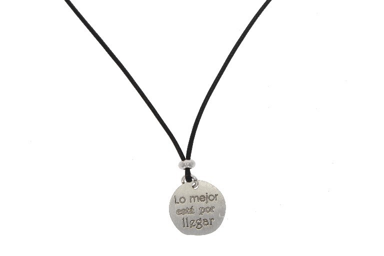 Gargantilla de cordón negro con cierre de plata y motivo con mensaje "Lo mejor está por llegar" , informal y significativa.