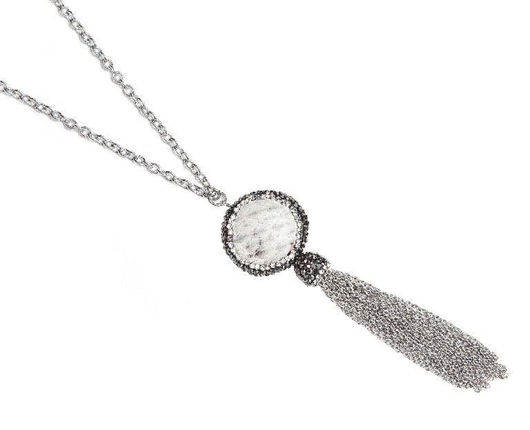 Collar de acero muy original y vistoso, motivo central de piel de serpiente rodeado de cristales de strass en blanco y gris. Mide 60 cm de largo.