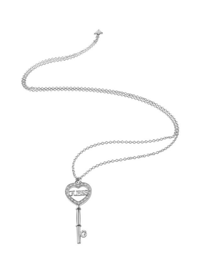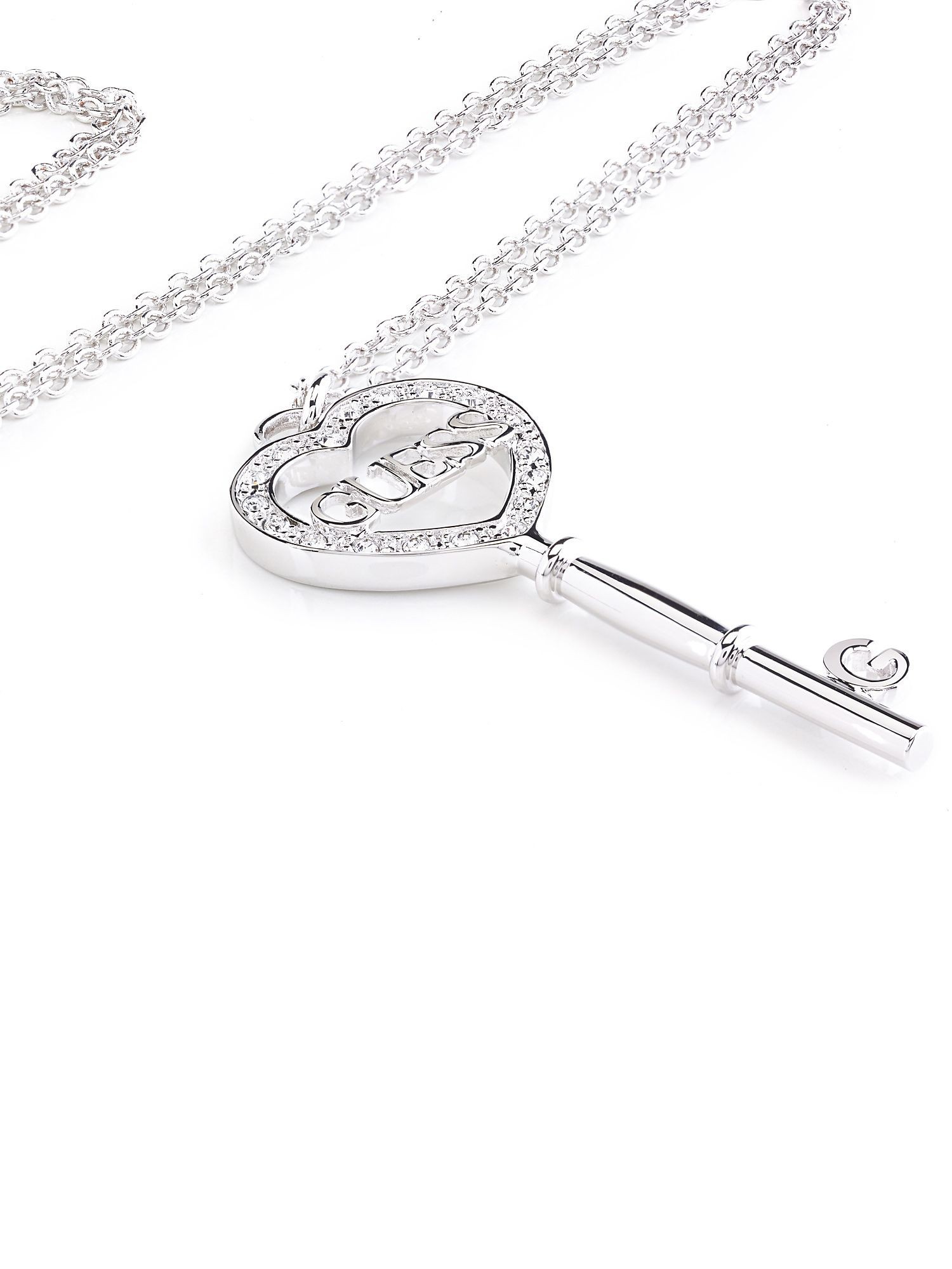 Collar largo con llave y marca Guess chapado en rodio. La llave lleva pavé de Swarovski. Mide 80cm de largo.